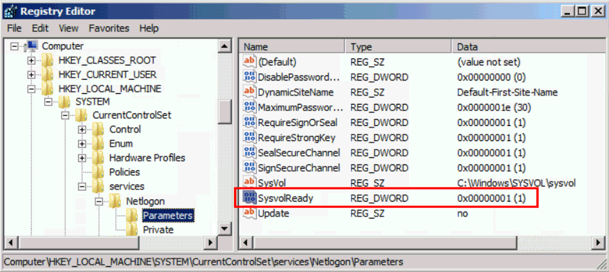 Windows Registry Editor Version 5.00 [HKEY_LOCAL_MACHINE\SYSTEM\CurrentControlSet\Services\Netlogon\Parameters] "SysVol"="C:\\Windows\\SYSVOL\\sysvol" "SysvolReady"=dword:00000000