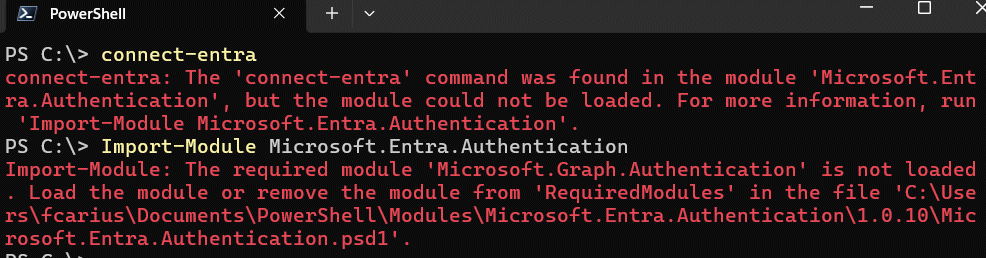 connect-entra: The 'connect-entra' command was found in the module 'Microsoft.Entra.Authentication', but the module could not be loaded. For more information, run 'Import-Module Microsoft.Entra.Authentication'.