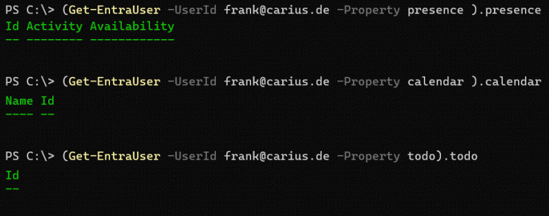 Das Ergebnis war immer "$null". Bei anderen Propereties wie "Todo", "Calendar", "Presence" bekomme ich ein Objekt mit Properties zurück, die aber auch leer sind:
