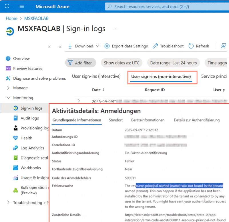 Den Fehler können Sie über die Entra ID SignIn analysieren.