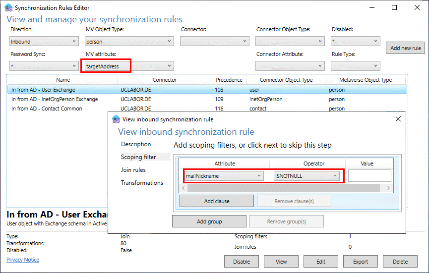 Erst wenn ich bei dem Benutzer einen Mailnickname pflege, überträgt ADSync zusätzlich die Felder "alias" und "TargetAddress".
