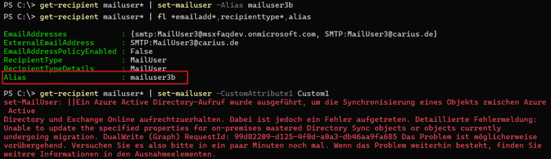 Es gibt aber ein "Set-MailUser" und da müssen Sie etwas vorsichtig sein. Es gibt keinen Parameter "-isExchangeCloudManaged $true" aber dennoch kann ich z.B. den Alias in der Cloud überschreiben, obwohl er eigentlich von ADSync replizert werden sollte. Selbst ein "FullSync" mit ADSync setzt den Wert nicht zurück. Die "Custom Attributes" hingegen kann ich mit dem bekannten "DualWrite"-Fehler nicht schreiben.