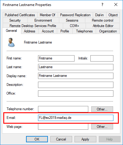- AD-User mit Mailadresse anlegen, deaktivieren und replizieren lassen
