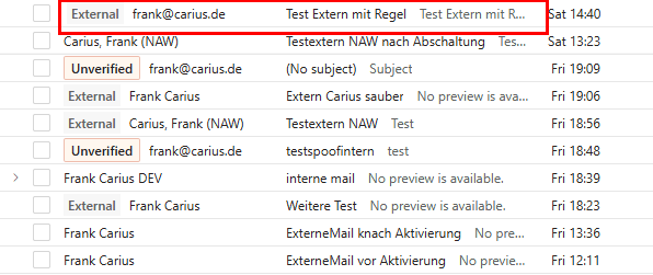 Sobald ich wieder eine Mail mit SPF/DKIM=PASS sende, sehe ich die Mail mit "External" aber ohne das "Unverified". Allerdings habe ich keinen Header gefunden, der das "Unverified" triggert. In der "Fälschung"-Mail war nur folgender Eintrag
