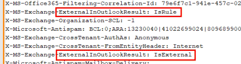 Interessant finde sich aber, dass auch die früher als "Extern" gekennzeichneten Nachrichten nicht mehr als solches markiert waren. Im Header stand aber immer noch das "X-MS-Exchange-ExternalInOutlookResult: IsExternal" drin.