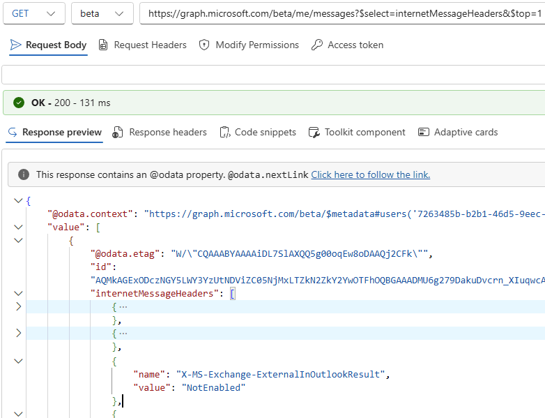 Aufgrund der Exchange Online EWS Abschaltung 2026 beschränke ich mich auf Microsoft Graph. Die Information über "ExternalInOutlookResult" steht leider nicht direkt in den Metadaten einer Mail, sondern stehen nur in den Internet-Headern. Diese lassen sich z.B. in Graph Explorer wie folgt für das eigene Postfach abrufen.