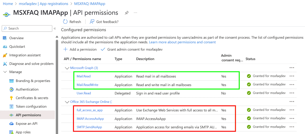 Mail.Read Mail.ReadBasic Mail.ReadBasic.All Mail.ReadWrite Mail.Send MailboxSettings.Read MailboxSettings.ReadWrite Calendars.Read Calendars.ReadWrite Contacts.Read Contacts.ReadWrite