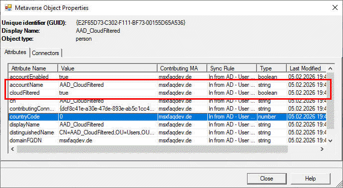 Sie sollten aber nie das Attribute "cloudFiltered" nutzen. Der Name könnte sie ja auf den Gedanken bringen, einfach die "Inbound Synchronization Rule" derart anzupassen, dass das Feld cloudFiltered bei diesen Objekten auf TRUE gesetzt wird. Wenn dann die Reihenfolge der Connectoren ungünstig ist, dann gewinnt dieses Feld und setzt "cloudFiltered=True" im Metaverse. Das bedeutet für ADSync dann aber, dass das Objekt nicht mehr in den Tenant repliziert wird. Da ist es dann auch unwichtig, ob das Objekt noch von einem zweiten lokalen AD-Forest durch ADSync importiert und ins Metaverse geschrieben wird. Das Objekt wird in Entra gelöscht. Wenn Sie ihren Fehler erkennen und beseitigen, dann wird die Undelete-Funktion nur die Benutzer (samt Postfach, OneDrive etc.) wieder zurückholen aber Verteiler und Devices werden neu angelegt und müssen neu berechtigt und gejoined werden. (Stand Feb 2026)