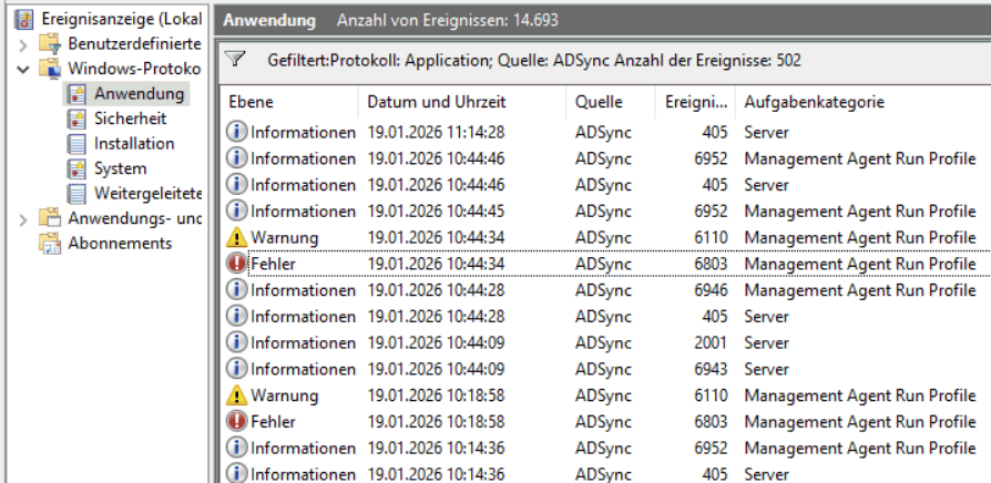 - EventID 6110 - Meldet den Fehler beim "Delta Import", d.h. das Lesen aus Entra ID in den lokalen Connector Space