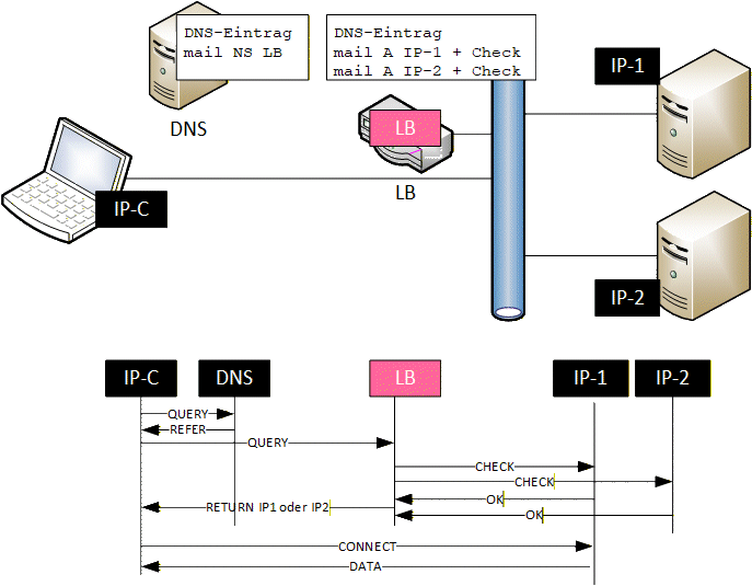 Die Schwächen von DNS Round Robin können wir aber mit einer Software lösen. Es gibt DNS-Dienste, die aktiv den Status von Servern abfragen und nur die IP-Adressen der erreichbaren Server zurückgeben. Diese Funktion ist in einem klassischen "Load Balancer" oft enthalten. Der DNS-Server für die Zone "msxfaq.de" hat dann keinen "A-Eintrag" für den Host "mail", sondern einen NS-Eintrag, um eine Zone "mail.msxfaq.de" auf eben diesen Loadbalancer zu delegieren.