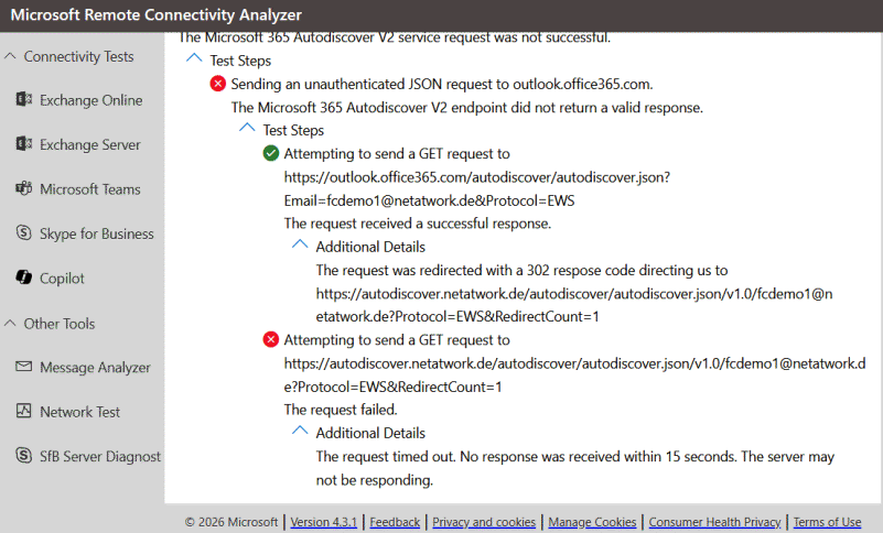 Es gibt einen Fall, wo Autodiscover V2 in Verbindung mit Microsoft Teams eine Rolle spielt. Ihr Anwender nutzt Microsoft Teams aber sein Exchange Postfach ist noch OnPremises. Wenn der Anwender dank Exchange Hybrid Mode aber auch in Exchange Online dann bekannt ist und dort eine Exchange Lizenz hat, dann versucht Microsoft Teams den Kalender einzublenden. Die Anzeige funktioniert aber nur, wenn Teams einen Weg zum lokalen Postfach finden. Hier fragt Teams zuerst den Exchange Online Service, der dann eine Umleitung auf den lokalen Benutzer ausliefert und Teams Online dann per Autodiscover V2 auf den lokalen Exchange Server zugreift und in der Folge dann per EWS auf das Postfach. Im Exchange Connctivity Analyzer ist dies gut zu sehen: