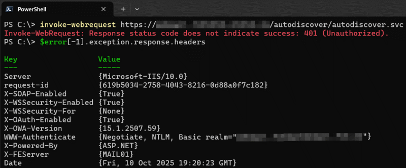 # Abfrage von Autodiscover Invoke-Webrequest https://autodiscover.<DNS-Domain>/autodiscover/autodiscover.svc $error[-1].exception.response.headers