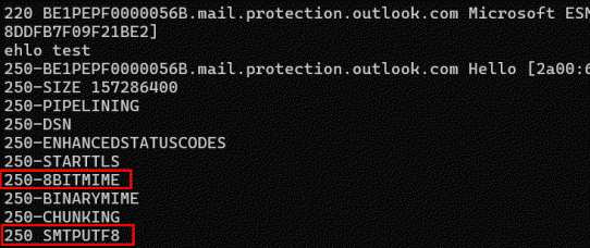 Auf der Seite SMTP-Telnet habe ich beschrieben, wie sie eine Mail per TELNET an einen SMTP-Server senden können. Wenn ich z.B. den Mailserver für die Domain msxfaqlab.onmicrosoft.com anspreche und mit einem EHLO begrüße, dann sehne Sie zwei Angebote für UTF8.