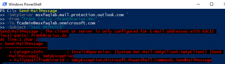 Send-MailMessage ` -SmtpServer msxfaqlab.mail.protection.outlook.com ` -From "Fränk Carius <fränk@carius.de>" ` -To fcadmin@msxfaqlab.onmicrosoft.com ` -Subject "Test SMTPUTF8"