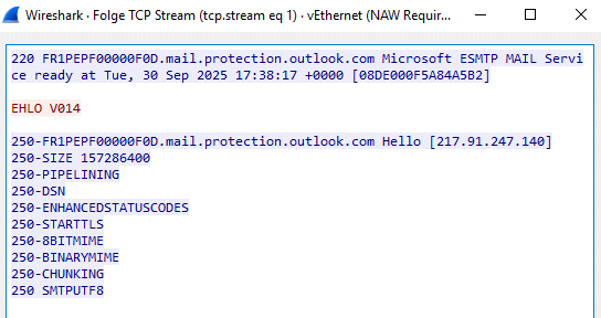 Der Fehler "Send-MailMessage : The client or server is only configured for E-mail addresses with ASCII local-parts" ist deutlich. Ich habe parallel die SMTP-Verbindung mit Wireshark mitgeschnitten und Send-MailMessage bricht schon direkt nach dem EHLO ab.