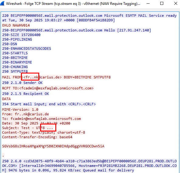 Um dies nachzustellen, habe ich auf meinem Exchange Online Tenant die IP-Adresse über einen Inbound Organization Connector für meine genutzte IP-Adresse als Relay konfiguriert und eine Mail per SMTPUTF8 über Exchange Online an einen Server ohne SMTPUTF8 gesendet.