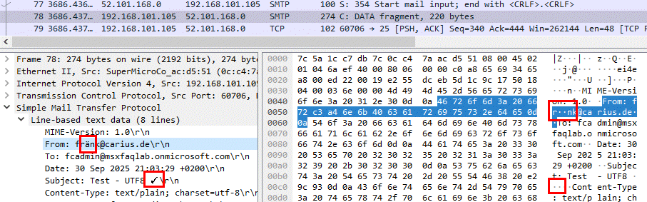 In der Detailansicht gibt Wireshark sehr wohl die 8-Bit-UNICODE-Ausgabe sauber aus und auch der "Haken" im Betreff wird angezeigt.