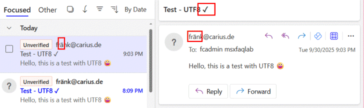 $smtpServer = "msxfaqlab.mail.protection.outlook.com" $smtpPort = 25 $from = "fränk@carius.de" $to = "fcadmin@msxfaqlab.onmicrosoft.com" $subject = "Test - UTF8 ✓" $body = "Hello, this is a test with UTF8 😀" # Create the SMTP message $message = New-Object System.Net.Mail.MailMessage $from, $to, $subject, $body $message.BodyEncoding = [System.Text.Encoding]::UTF8 $message.SubjectEncoding = [System.Text.Encoding]::UTF8 # Create the SMTP client $smtp = New-Object System.Net.Mail.SmtpClient $smtpServer, $smtpPort $smtp.DeliveryFormat=[System.Net.Mail.Smtpdeliveryformat]::International $smtp.EnableSsl = $false # Send the message (no authentication) $smtp.Send($message)