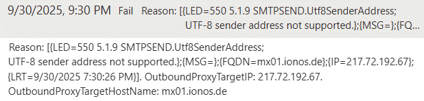 550 5.1.9 SMTPSEND.Utf8SenderAddress; UTF-8 sender address not supported
