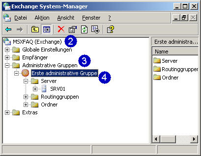Interessant ist hierbei, dass für die nachfolgende Betrachtung die genaue Kenntnis der Struktur wichtig ist, da der Exchange System Manager erst bei der Organisation beginnt (2), aber zwischen dem Container "Service" in der Konfigurationspartition und der Organisation noch ein weiterer Container liegt, der für die Vergabe von Berechtigungen wichtig ist.