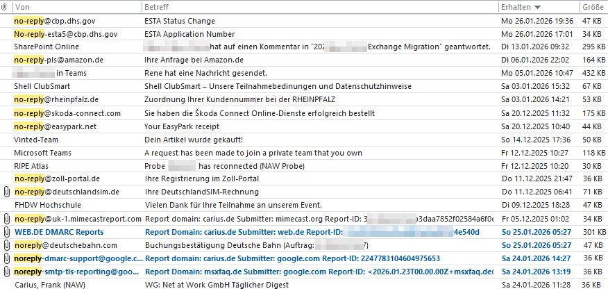 Wir sehen hier sogar Absender, die ihrer Adresse einen Displaynamen vergeben haben. Andere machen das Noreply in unterschiedlichster Schreibweise sichtbar. Einige Mails sind wirklich nur für den Empfänger relevant und bei DMARC-Reports ist es sogar ein Service des Absenders, mit diese Details zuzustellen und ich bestimmte als Empfänger, wohin diese Mails gehen. Bei den Mails zu ETA und ESTA bin ich als Person ebenfalls in der Pflicht, eine gültige und funktionierende Adresse anzugeben. Auf der anderen Seite wird sich niemand manuell darum kümmern, sich um unzustellbare Mails zu kümmern. Wenn ich aber an Absender wie "Easypark", "Deutsche Bahn", "Zoll-Portal" denke, dann sind das allesamt Dienste mit einem Konto oder App. Diese Absender könnten sehr wohl eine Rückantwort über Zustellfehler o.ä. wieder an das Konto zuordnen und z.B. in einer App oder bei der nächsten Nutzung des Diensts darüber informieren.