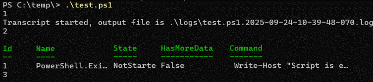 Diesen Code als PS1-Datei auszuführen hat aber keine Reaktion gezeigt. Wir sehen die drei Ausgaben und den Start aber kein Ende.