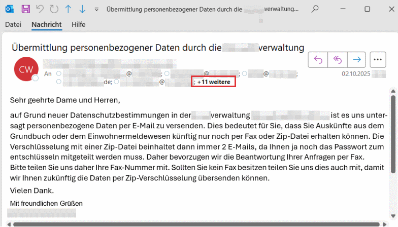 Anfang Oktober 2025 habe ich eine Mail gesehen, bei der es mir fast die Sprache verschlagen hätte. Da informiert eine Kreisverwaltung, dass sie aus Datenschutzgründen gewisse Informationen nicht mehr per Mail, sondern als Fax senden müssten.