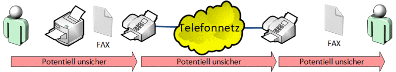 Das ist dann etwas besser gesichert aber der Absender kann nicht kontrollieren, wie der Empfänger mit der Information umgeht. Schon das Bild zeigt, dass es in der "Papiervariante" noch unsicherer ist und selbst bei der Nutzung von Faxservern beim Absender und Empfänger die Sicherheit nicht besser ist, als bei einer Mail. Für Geheimdienste, Ermittlungsbehörden etc. gehört es seit Jahrzehnten zum Standard eine Fax-Übertragung abzuhören aber im Gegensatz zu SMTP mit STARTTLS und der Möglichkeit einer verpflichtenden Zertifikatprüfung gibt es dies bei FAX nicht.