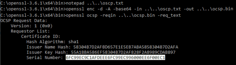 # OpenSSL Base64Decode openssl enc -d -A -base64 -in ocsprequest.txt -out ocsprequest.bin #OpenSSL Decoding openssl ocsp -reqin ocsprequest.bin -req_text