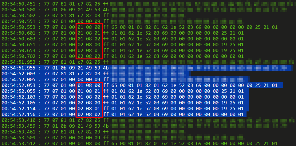 Wenn bei ihnen keine Werte ankommen, dann können Sie auf der Tasmota Konsole unter http://192.168.178.xxx/cs? einfach den Befehl "sensor53 d 1" oder "sensor53 d 2" eingegeben um die eingehenden Rohdaten zu sehen. Der Dump zeigt, dass im Abstand von ca. 1,3 Sekunden ein komplettes Datagramm gesendet wird, welches mit "77 01" beginnt, ein paar Daten zum Zähler (unkenntlich) liefert und dann die sechs Zählwerke mit ihrem dem aktuellen Stand sendet.