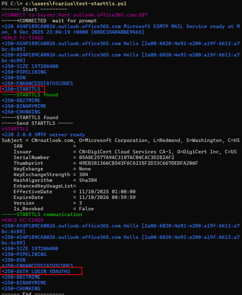Für gewöhnlich nutze ich Programme wie Blat oder Commandlets wie "Send-MaiMessage" (Siehe PowerShell und Mail) um eine Mail an ein System zu senden. Manchmal tut es aber auch ein Telnet (Sehe SMTP-Telnet). Da scheitere ich dann aber doch schnell, wenn ich Verschlüsselt per STARTTLS kommunizieren möchten. Das Zertifikat können Sie zwar auch mit OpenSSL anzeigen lassen, aber das wollen Sie vielleicht auch nicht auf einem Server mal eben installieren. Das geht aber alles auch per PowerShell, das sie sich auch anschauen und ggfls. anpassen können.