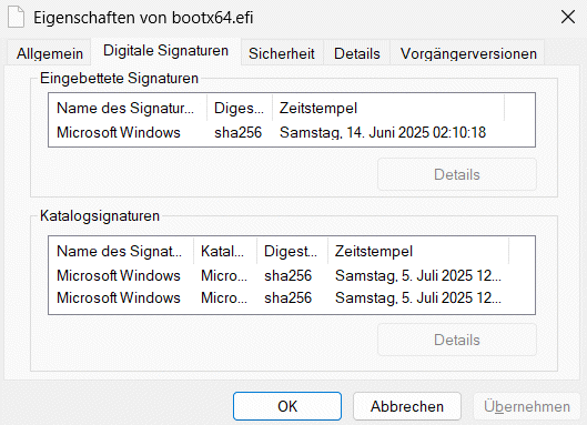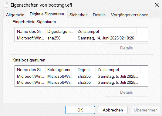 Hier sollte ein normaler Windows Client mit Updates schon länger kein Problem damit haben aber zur Sicherheit können wir dies testen. Microsoft will in dem Zuge auch die Zertifikate aktualisieren, die zur Signatur von Linux UEFI-Loadern signiert werden - Absicherung gegen BlackLotus