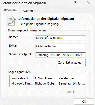 Mit dem Windows Explorer kann ich mir die Details der Signatur anzeigen lassen.